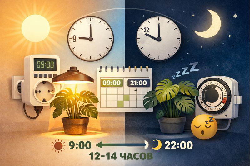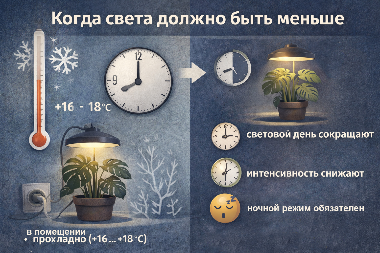 Растение может годами «стоять», не погибая, но при этом постепенно терять декоративность. Досветка позволяет перевести растение из режима выживания в режим стабильного роста.
