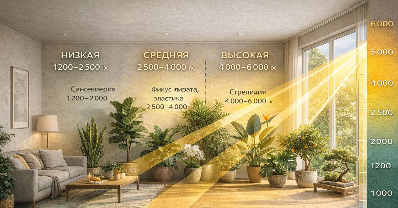 Ниже — ориентировочные значения освещённости на уровне листьев:
