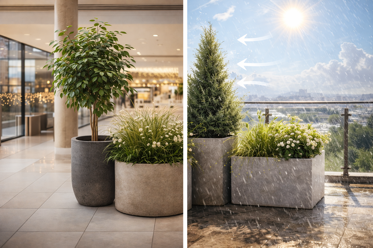 Подходят только адаптированные уличные растения и правильные кашпо.